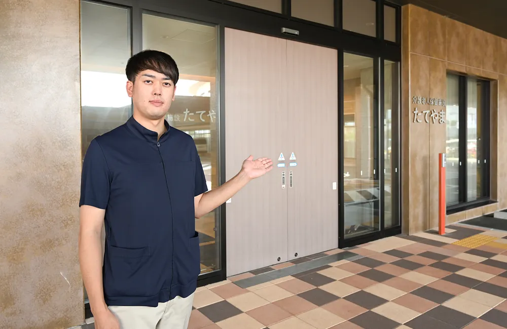 「館山病院とは渡り廊下でつながり、病院から異動してきた職員も複数名勤務していて、医療との連携体制も万全。施設内はどこもきれいで新しく、紹介したい場所がたくさんあります。さっそく中へどうぞ!」。