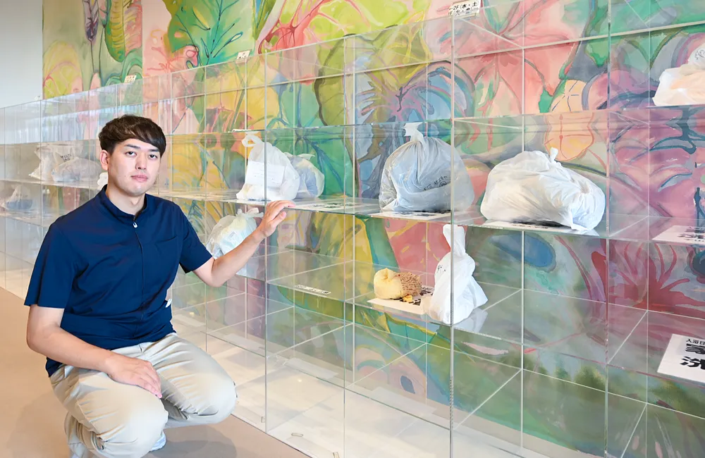 「こちらは、土を固めて層を重ねた、まさに地層のような土壁です。新築移転前の館山病院が建っていた長須賀の土や、館山を代表する美しいビーチの平砂浦海岸の砂などを使用していて、地域貢献してきた病院の歴史と住民の方々のさまざまな想いが積み重なって今につながっていることを表現しています」。