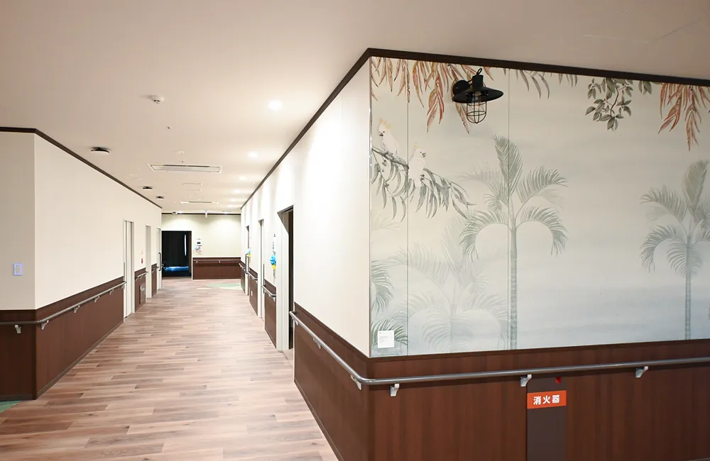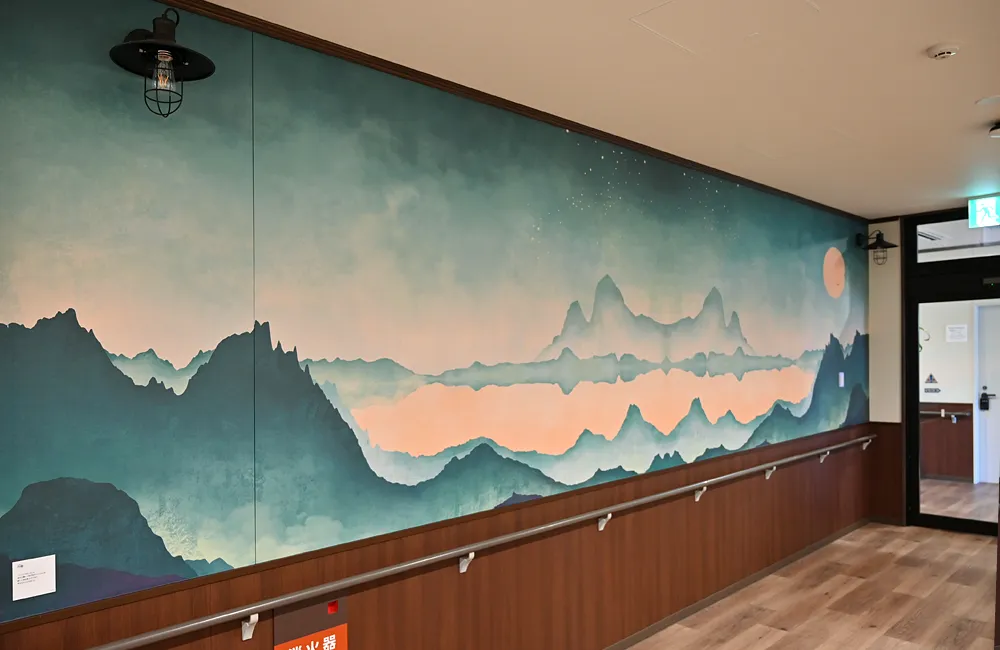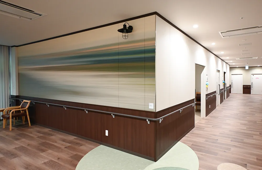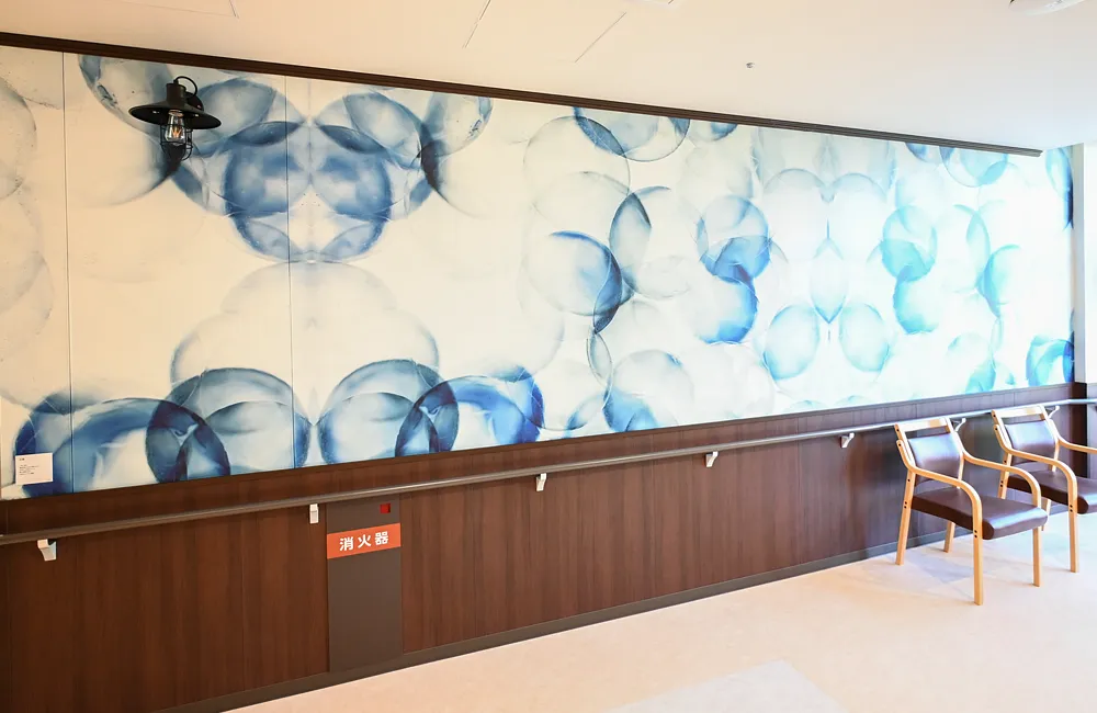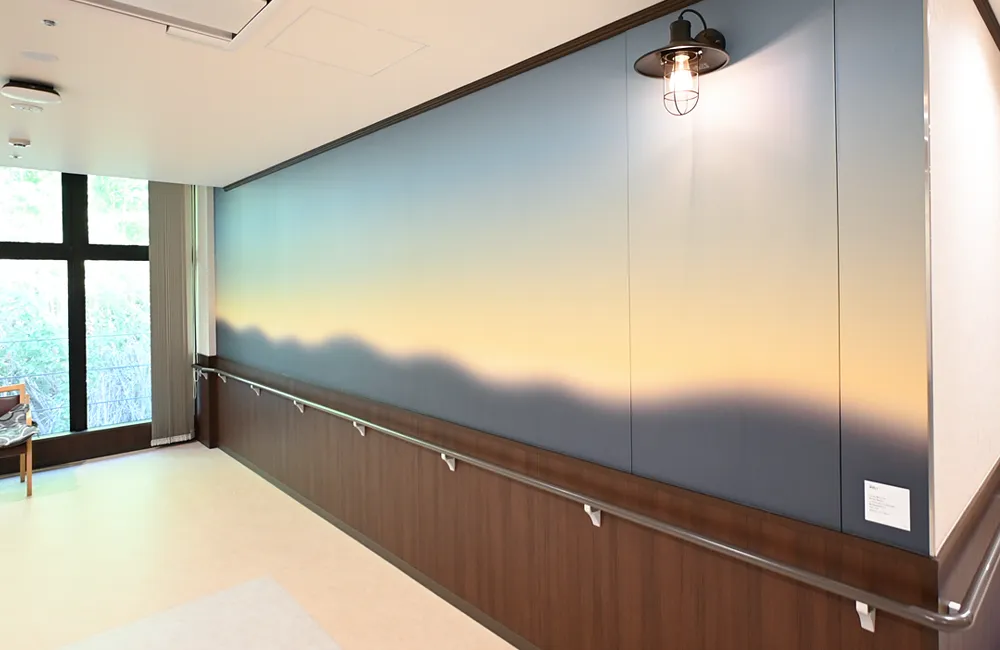 「このような大きな壁画アートは施設内に全部で11作品あり、職員も癒されています。作品を前に利用者様とコミュニケーションが生まれたり、作品めぐりをきっかけにリハビリを促したりもしています」。