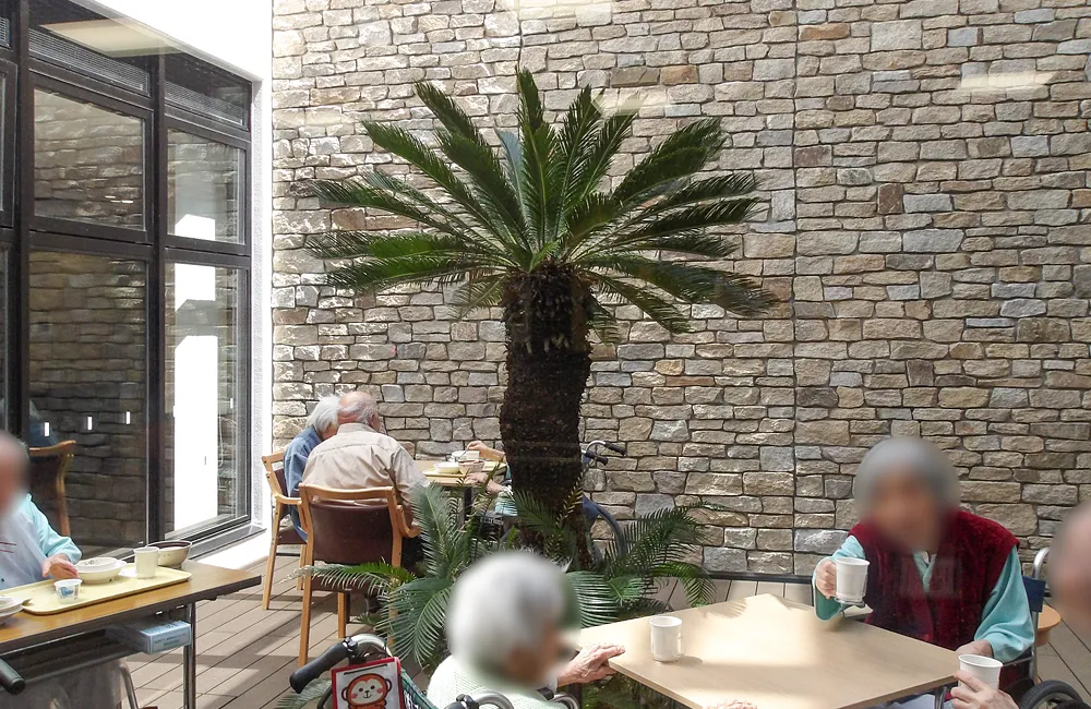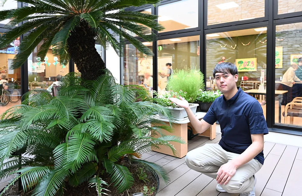「フロアの中心に中庭を設け、たっぷりと自然光が差し込む空間を実現しました。天気が良い日は、中庭で利用者様が日光浴を楽しんだり、テーブルと椅子を出して青空カフェをオープンしたりしています」。