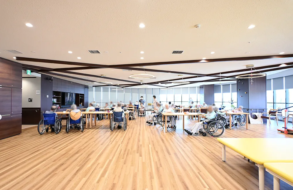 「こちらの大きな円形のホールは、食堂兼機能訓練スペースとなっていて、窓からはリゾート感あふれるヤシ並木を眺めることができて、晴れた日は富士山も望め、開放感抜群です。やわらかい照明、おしゃれな内装デザイン、使いやすい家具などにもこだわり、快適な居住空間と我が家のようなアットホーム感を実現しました」。