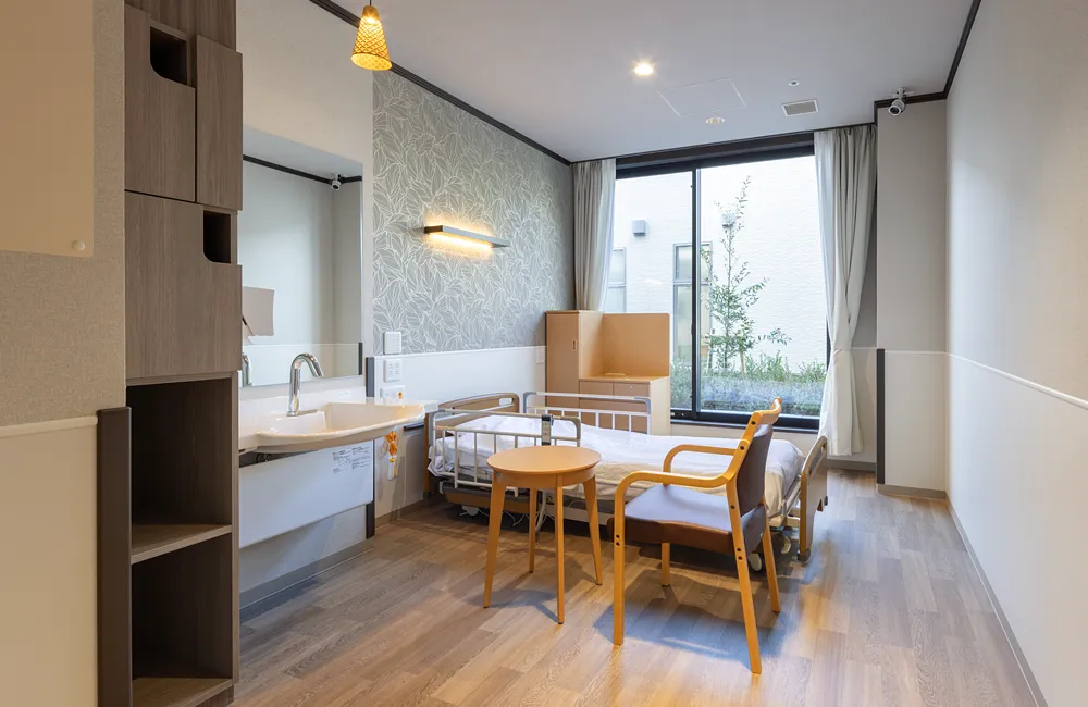 「居室は個室と多床室(4人部屋)があり、こちらは個室です。多床室もカーテンで仕切りをつくってプライバシーに配慮しています。どの居室もテレビ・携帯電話の持ち込みが可能で、多床室で使用する場合はイヤホン着用をお願いしています」。