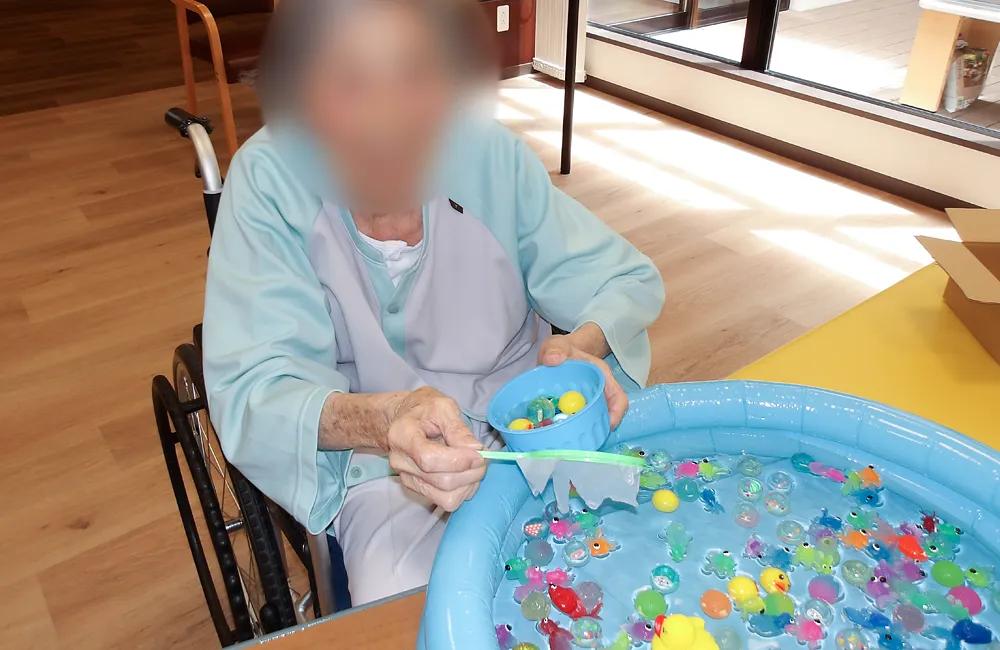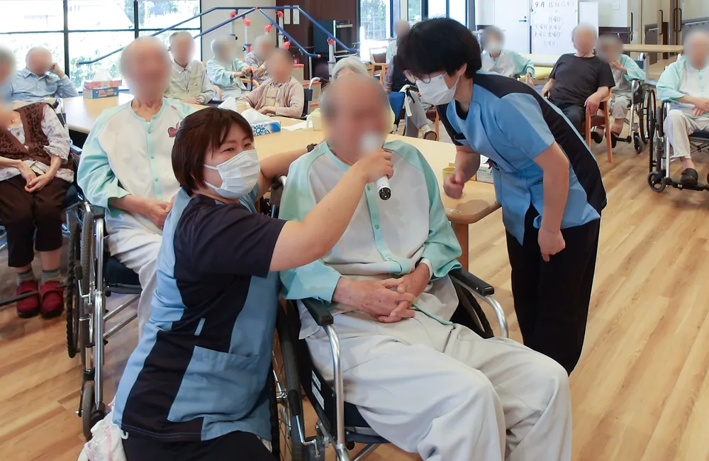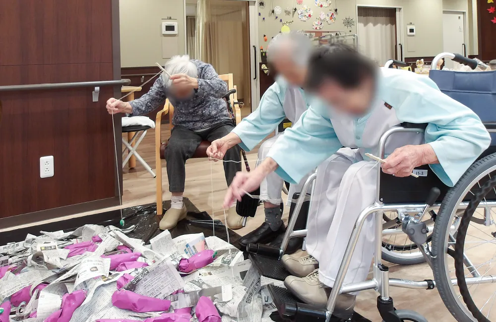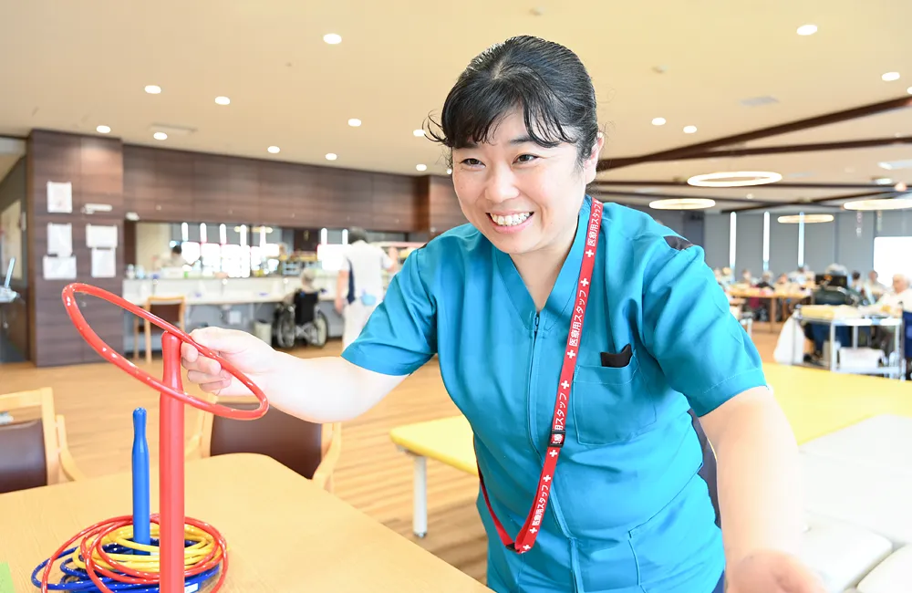 「介護職が中心となって、ボール遊び・リズム体操・折り紙・カラオケ・モグラたたきなど、毎日さまざまなレクリエーションを企画・開催しています。なるべく手や指、体全体を使って脳を刺激する遊びを考案していて、牛乳パック・紙コップなどを用いた創作ゲームも利用者様から人気です」。