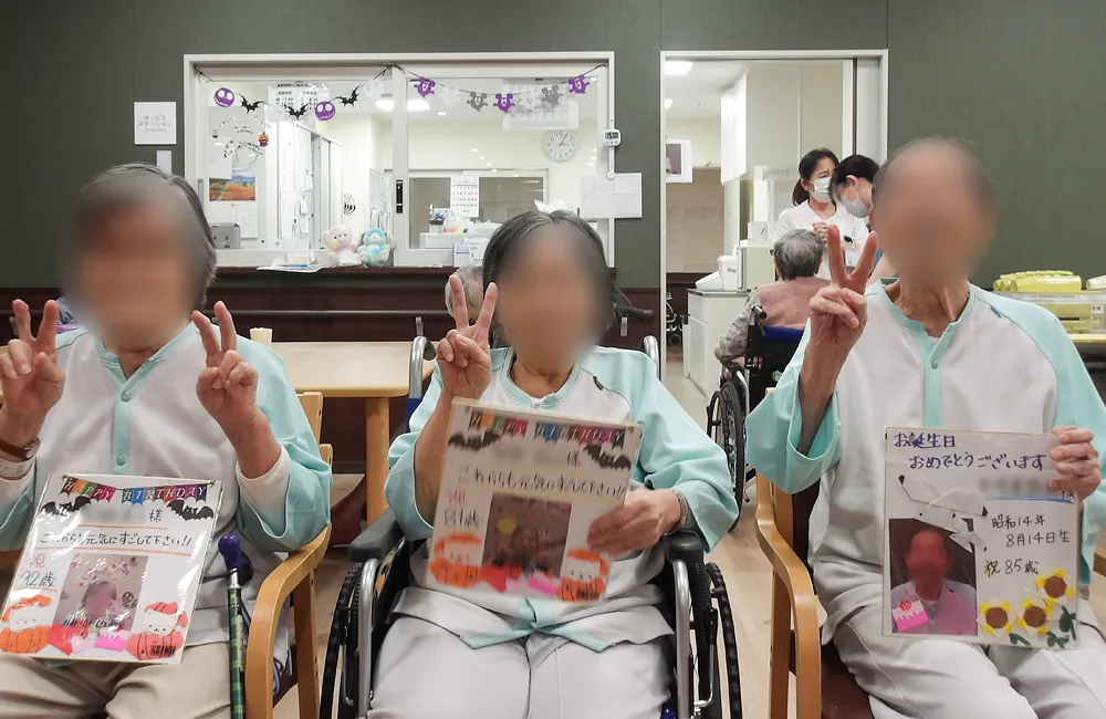 「また、利用者様のお誕生日には、職員から色紙をプレゼントしたり、バースデーソングを歌ってケーキを食べたりしてお祝いしています」。