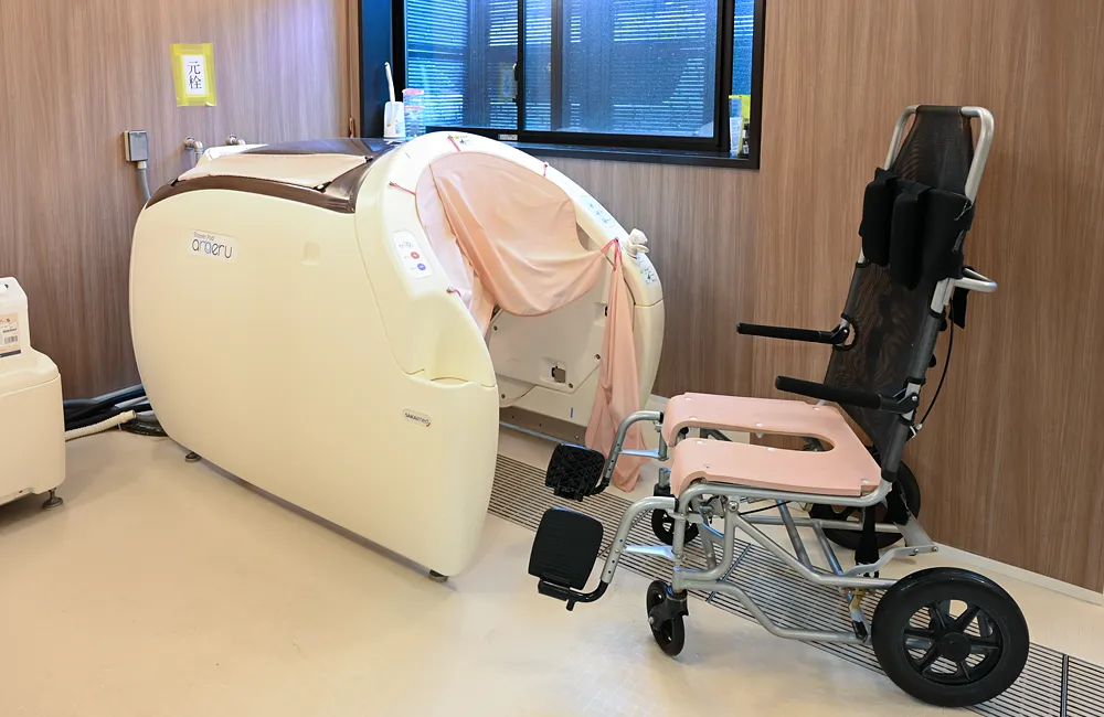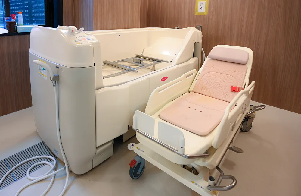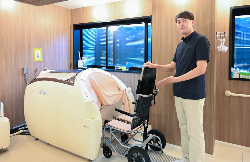 「最新の入浴機器『アラエル』も導入しています。座ったまま入浴できるシャワー浴槽で、介助する側・される側の負担を減らすことができて、洗浄力も衛生面も優れています」。