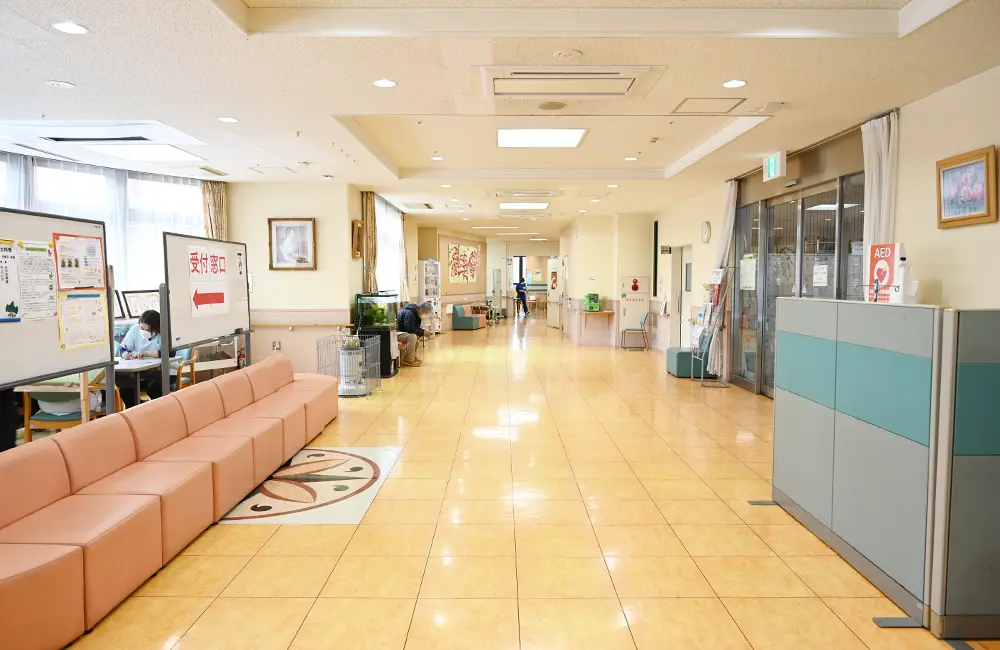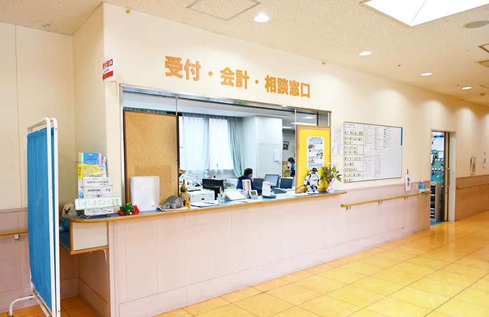 玄関を入ると、広くて明るいロビーがあります。左手には受付窓口があり、事務スタッフさんと介護ロボット「パルロ」が迎えてくれました。