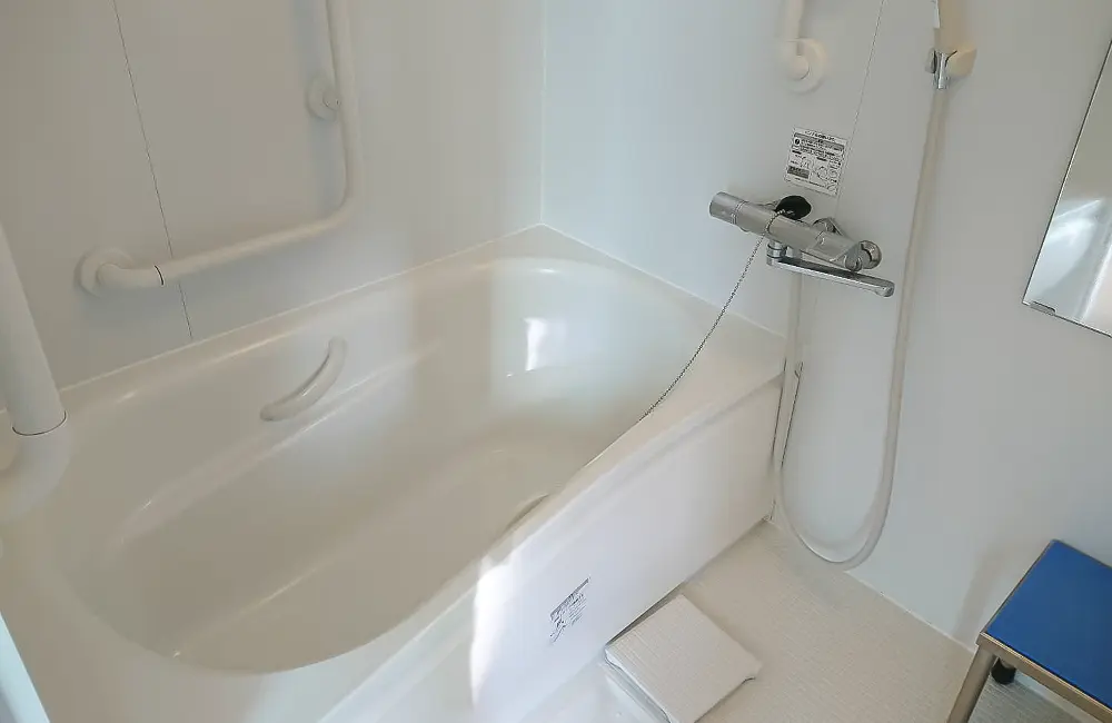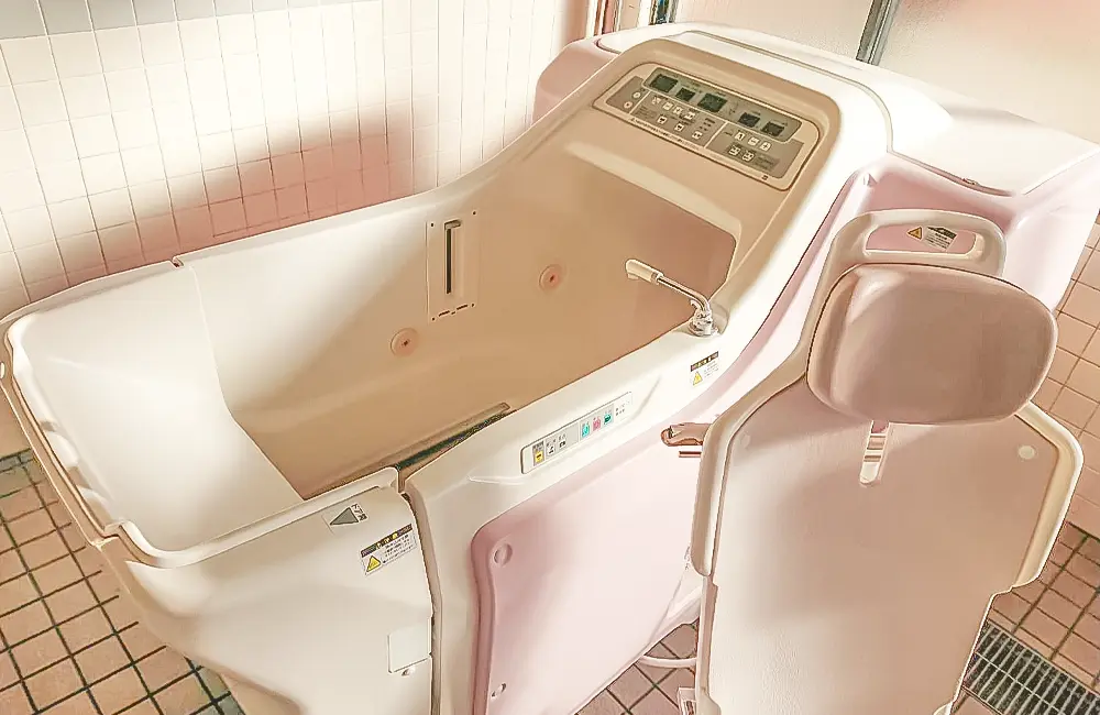 「一般浴(大浴場)、個浴、機械浴がご利用できます。大浴場は多くの利用者様から人気で、ときどきリラックスされた利用者様の鼻歌も流れます。おひとりで入浴できる個浴は、他者との入浴に戸惑いのある方にご案内したり、在宅復帰の練習に活用したりしています」。