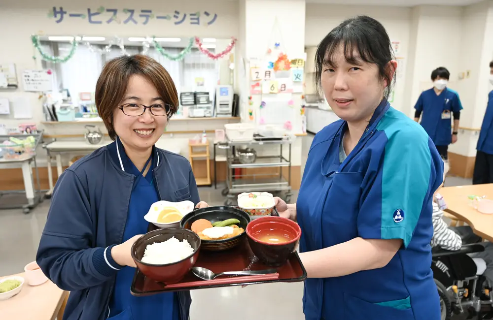 「ミールラウンドとは、いつまでも口から美味しく召し上がっていただけるよう、管理栄養士と言語聴覚士が連携して食事の様子を観察することです。当施設では、栄養バランス・健康・病状などに配慮した食事を、かむ力・飲み込む力に応じた形態に調整し、食が細い方もしっかり栄養を取れるように工夫するなど、お一人おひとりに合わせた食事の提供に努めています。栄養科では、季節にちなんだ行事食にも力を注いでいて、利用者様からとても好評です」。
