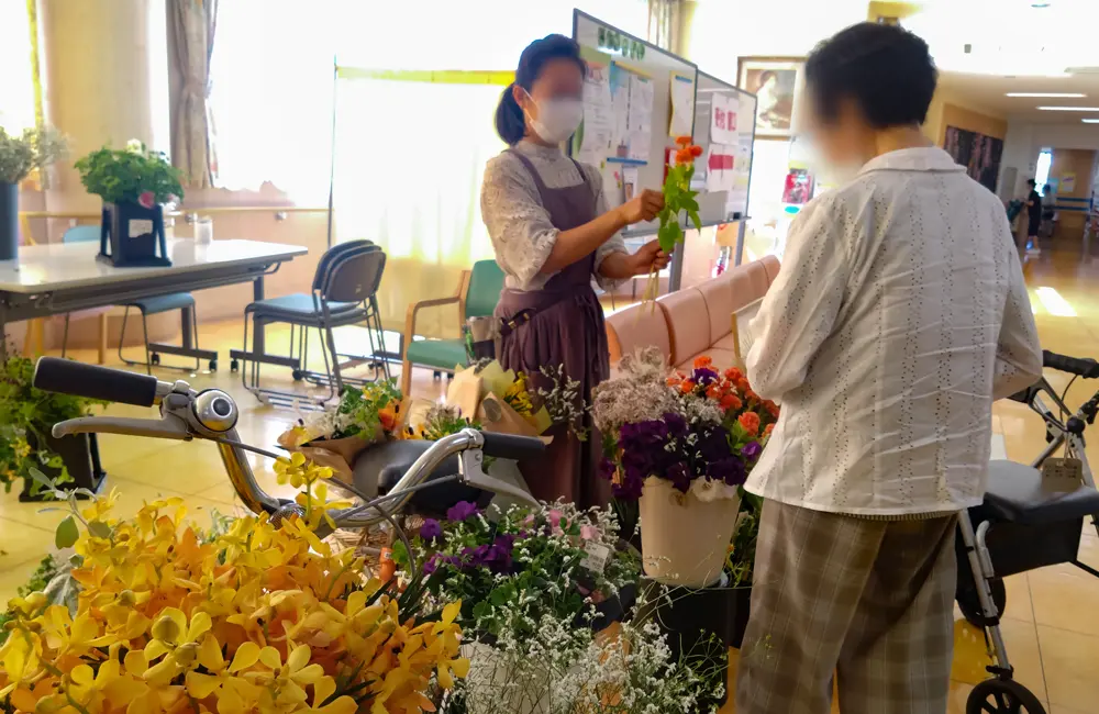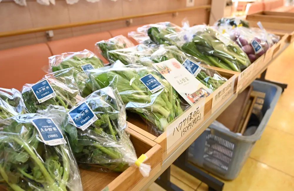 「毎月定例で、地域の農場や商店の方のご協力いただき、施設内で利用者様にお買い物を楽しんでいただいています。障害者就労支援にも取り組む『えか自然農場』さんの有機野菜販売は、人気が高いです」。